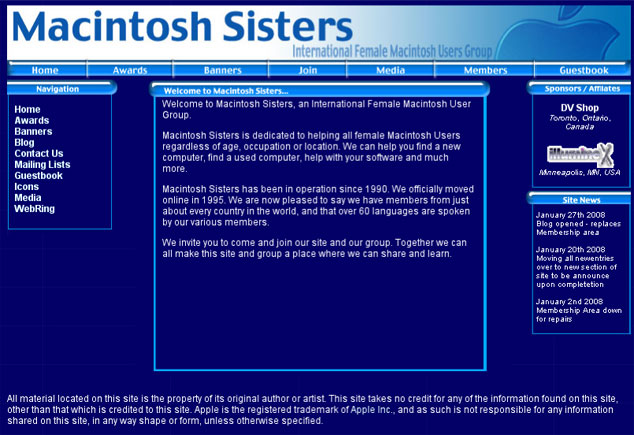Macintosh Sisters is an international group of women who use the Macintosh computer, this site was developed to help connect female macintosh users around the world and help them get their questions answered and in general help them with their experiancing using the platform.